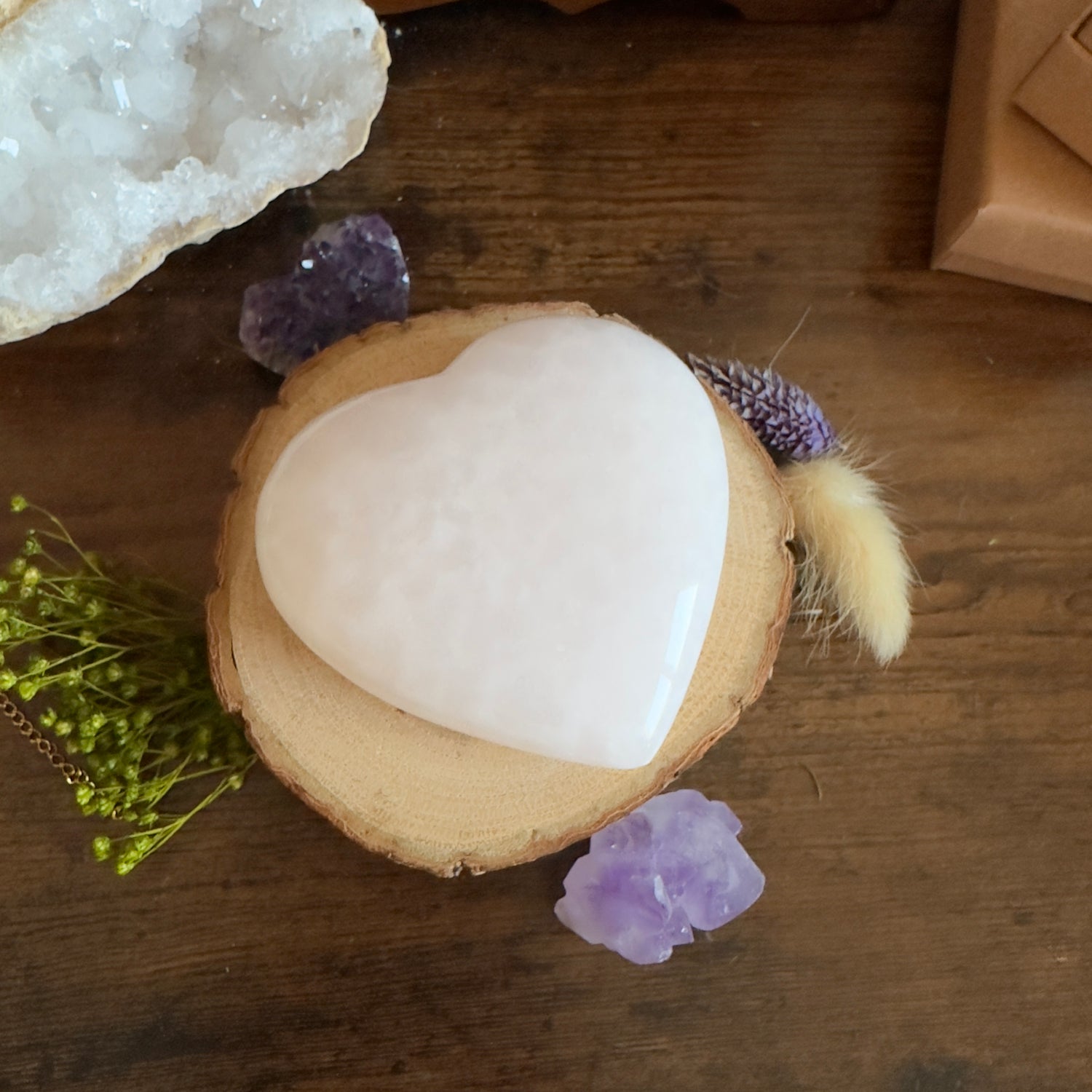 Découvrez la douceur lumineuse de notre cœur en Manganocalcite, une pièce rare et peu commune aux nuances rosées naturelles et profondément apaisantes.