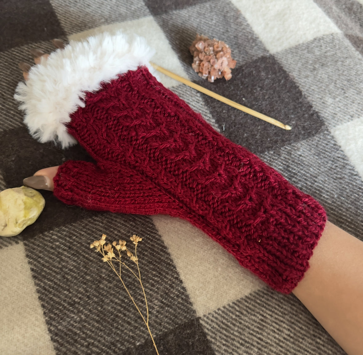 Chaque paire de mitaines est façonnée avec soin, héritière d’un savoir-faire inspiré des traditions celtiques. Les entrelacs, symboles de protection, se mêlent à la douceur d’une fausse fourrure végane, une matière choisie pour réchauffer sans jamais prendre au vivant ce qu’il n’a pas à offrir. Évoquant la chaleur des hivers d’autrefois, cette fourrure d’inspiration ancienne devient aujourd’hui un geste éthique.