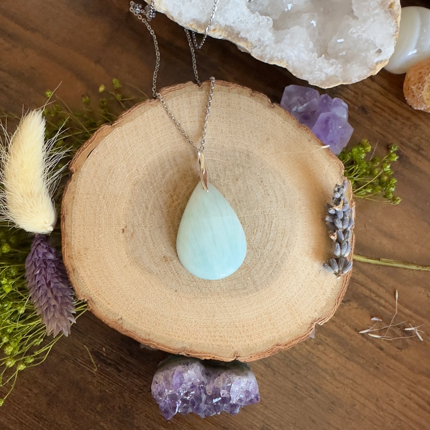 Découvrez la sérénité pure de notre pendentif en Aragonite Verte de Russie, taillé artisanalement et monté sur une bélière en argent 925.