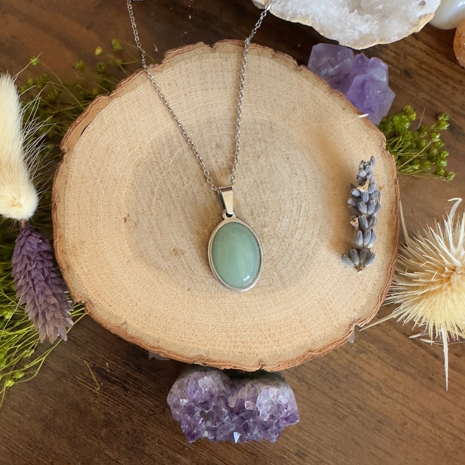 Découvrez l’éclat scintillant de notre pendentif en Aventurine Verte, serti sur une monture en acier inoxydable argentée, façonnée artisanalement.